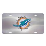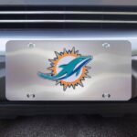 Fins up Dolphins!Enhance the exterior of your vehicle and show everyone who your favorite team is with this stainless steel License Plate. The Chrome plate and 3D full color team logo will positively pop, making the front of your vehicle very attention grabbing. Since the plate is stainless steel and the logo is made from enamel plated metal, the Die Cast Plate can withstand any weather conditions. The plate includes 4 pre drilled holes for easy installation, but also make sure there is a secure fit so that there is no rattling while driving. Make sure your plate and logo stay looking new by applying standard vehicle wax.